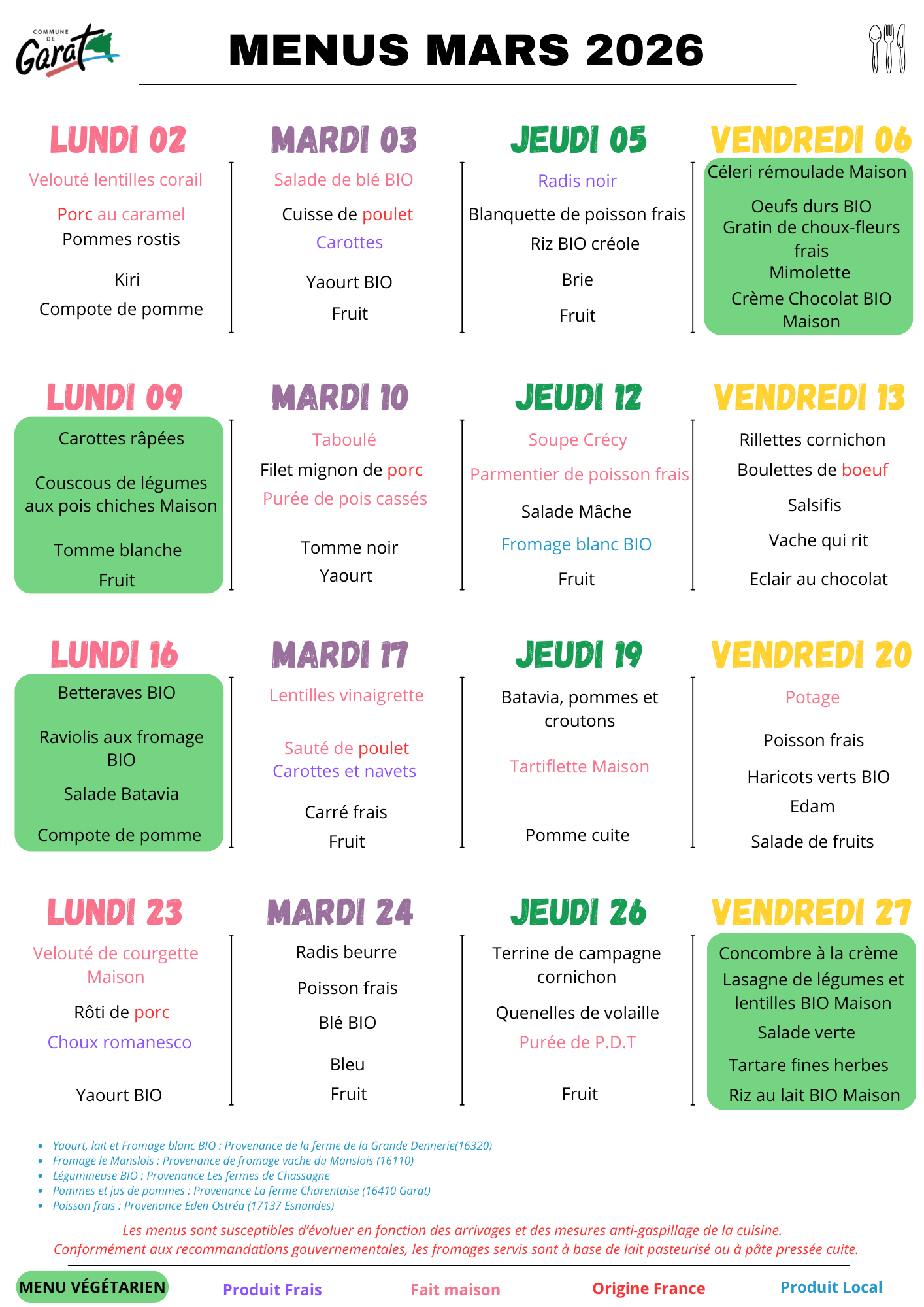 MENU CANTINE MARS 2026 Le dimanche 01 Mar 2026 à 18h39 PM Les categories associées : Restauration scolaireJ’aime ma villeNous contacterDroits et DémarchesNos agendasAssociationsMenusSallesUrgences et GardesPartager :